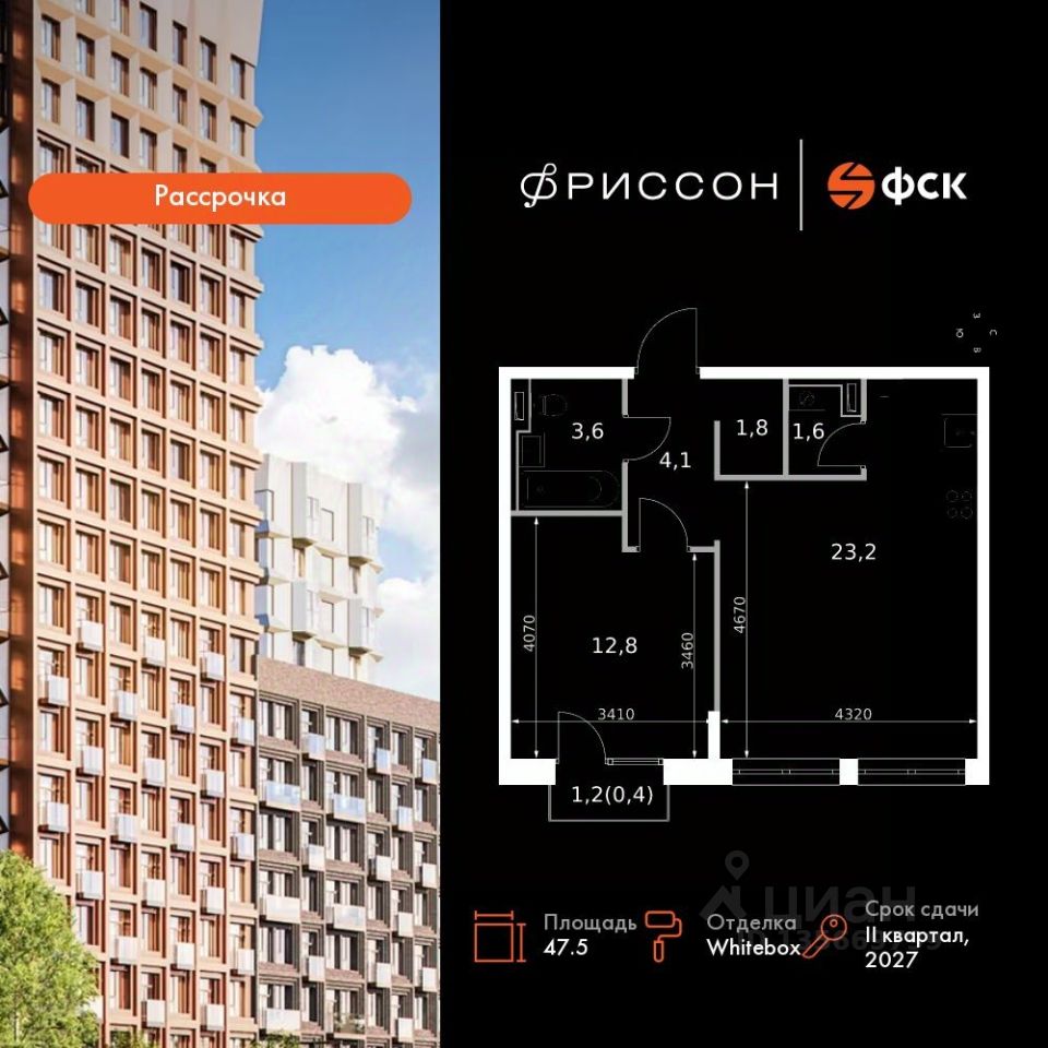 Продаётся 2-к квартира номер 310 общей площадью 47.5 кв.м. на 6-м этаже 8 этажного здания. Отделка Whitebox. Цена с учётом скидки.