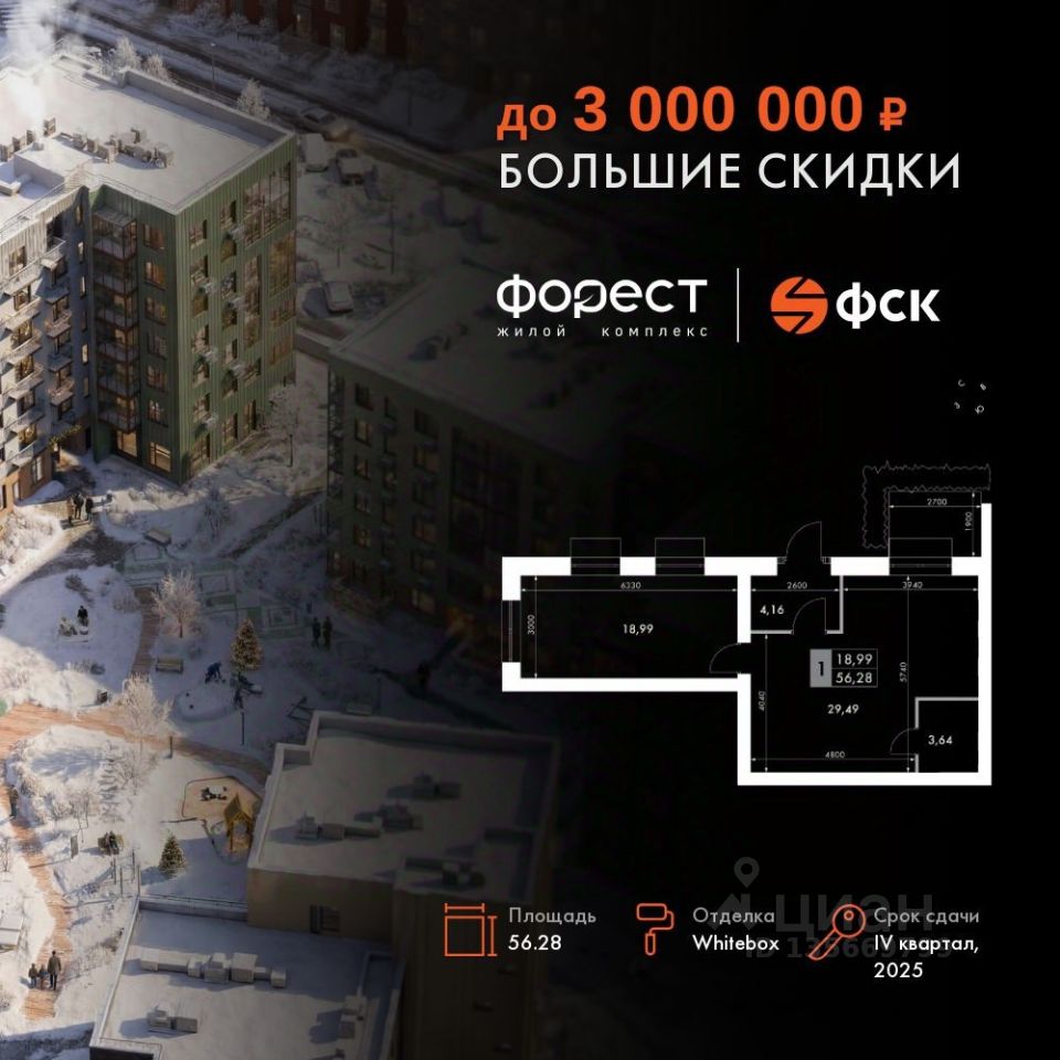 Продаётся 1-к квартира номер 65 общей площадью 56.1 кв.м. на 1-м этаже 4 этажного здания. Отделка Whitebox. Цена с учётом скидки.
