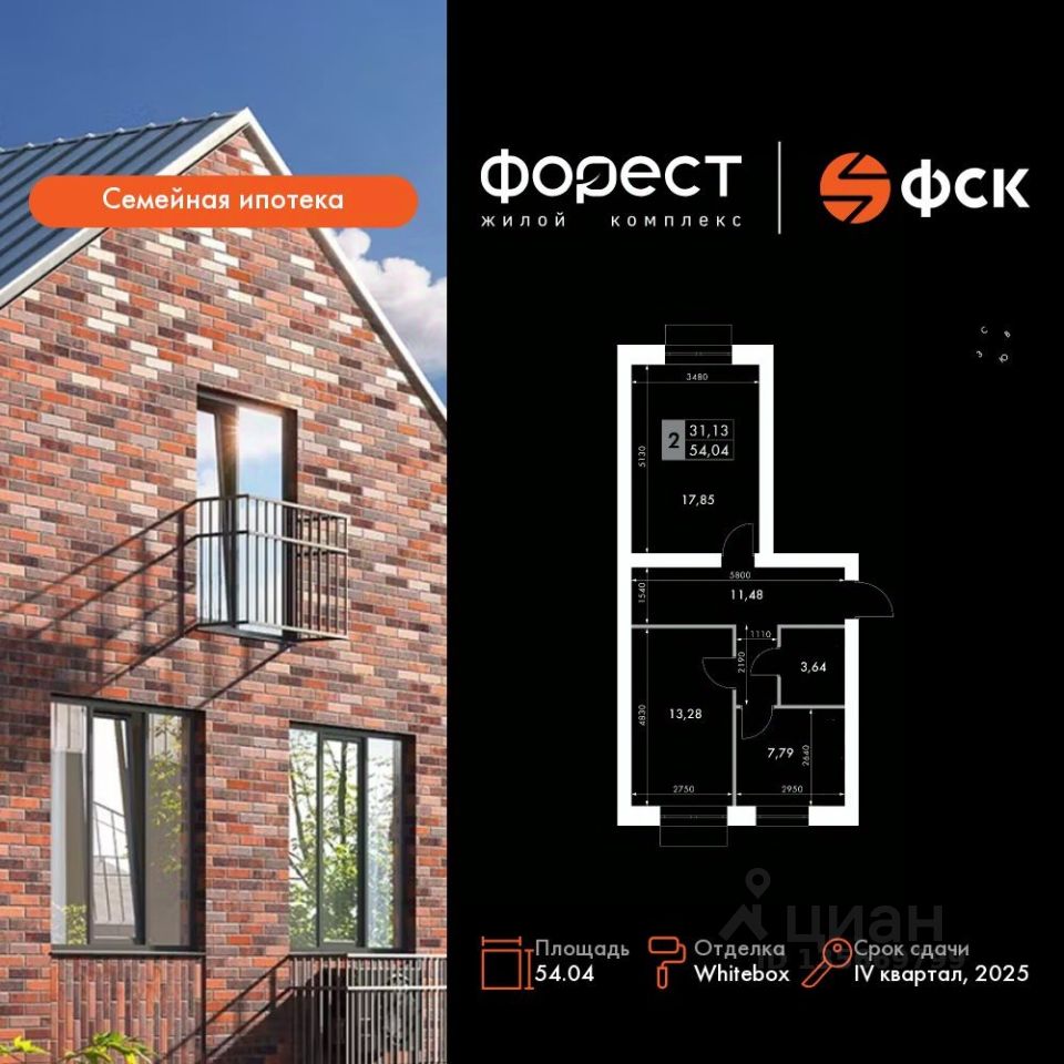 Продаётся 2-к квартира номер 91 общей площадью 54.04 кв.м. на 2-м этаже 4 этажного здания. Отделка Whitebox. Цена с учётом скидки.