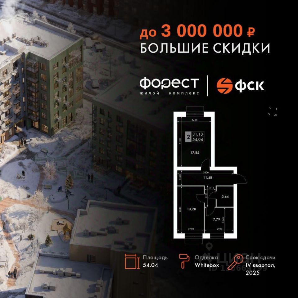 Продаётся 2-к квартира номер 91 общей площадью 53.7 кв.м. на 2-м этаже 4 этажного здания. Отделка Whitebox. Цена с учётом скидки.