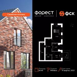 Продаётся 1-к квартира номер 116 общей площадью 60.46 кв.м. на 1-м этаже 4 этажного здания. Отделка Whitebox. Цена с учётом скидки.