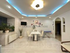 Выход с кухни на утепленную лоджию с диваном и удобной кладовой. Окна выходят во двор.