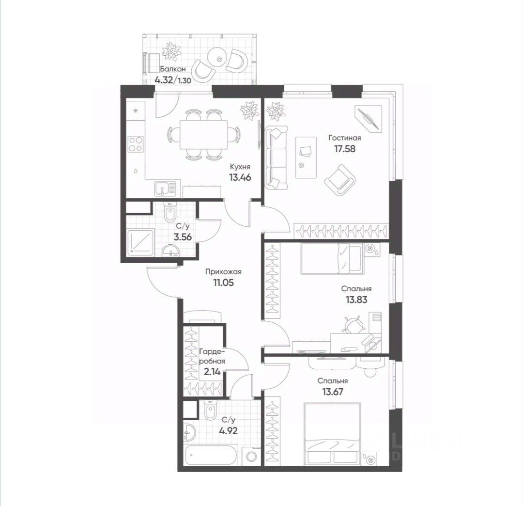 5. Планировка. Качественная предчистовая отделка, отдельная гардеробная, просторный санузел, большая кухня-гостиная с выходом на балкон.