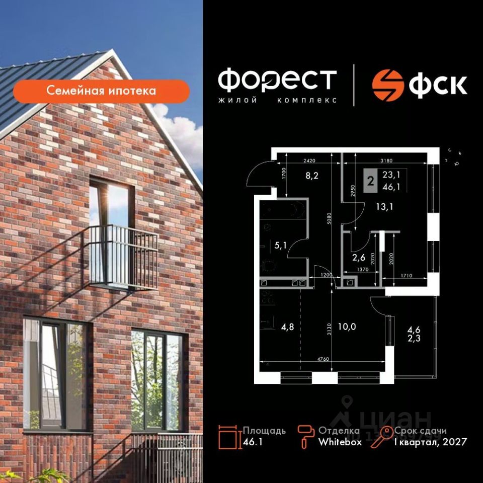 Продаётся 2-к квартира номер 82 общей площадью 46.1 кв.м. на 5-м этаже 6 этажного здания. Отделка Whitebox. Цена с учётом скидки.