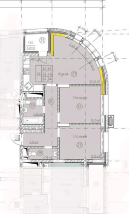 Квартира общей площадью 64,4 кв.м. имеет оптимальную планировку: