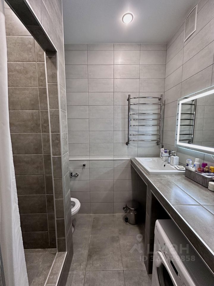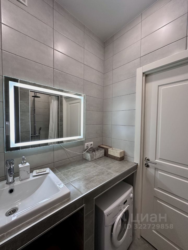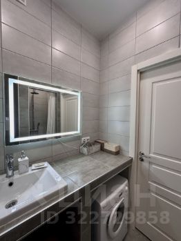 В ванной — современная душевая система с тропическим душем, большое зеркало с подсветкой, подключен гигиенический душ.