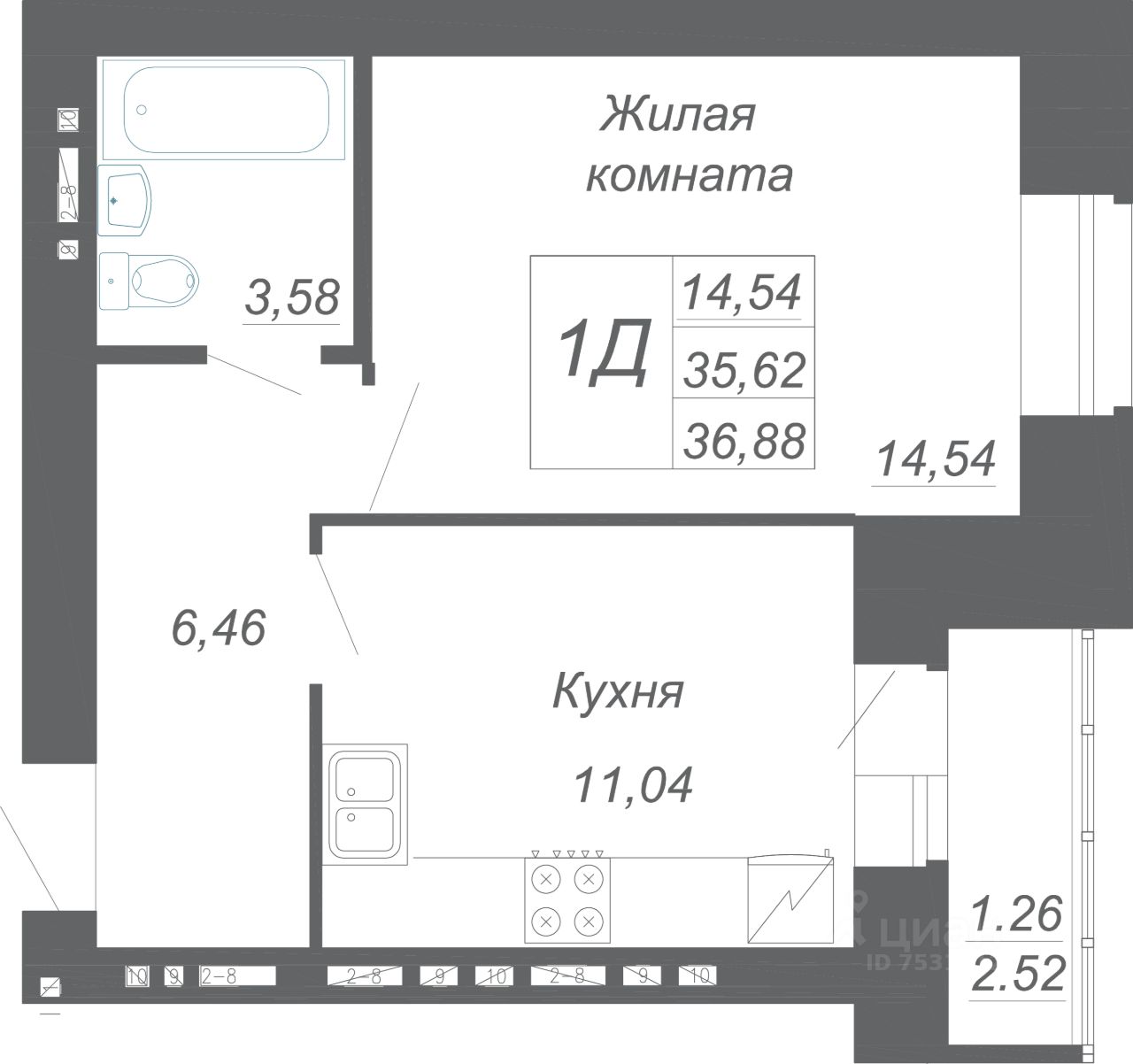 Продаётся 1 комнатная квартира 52 — 36.88 кв. м. Расположена на 4 этаже. Дом построен из силикатного кирпича.