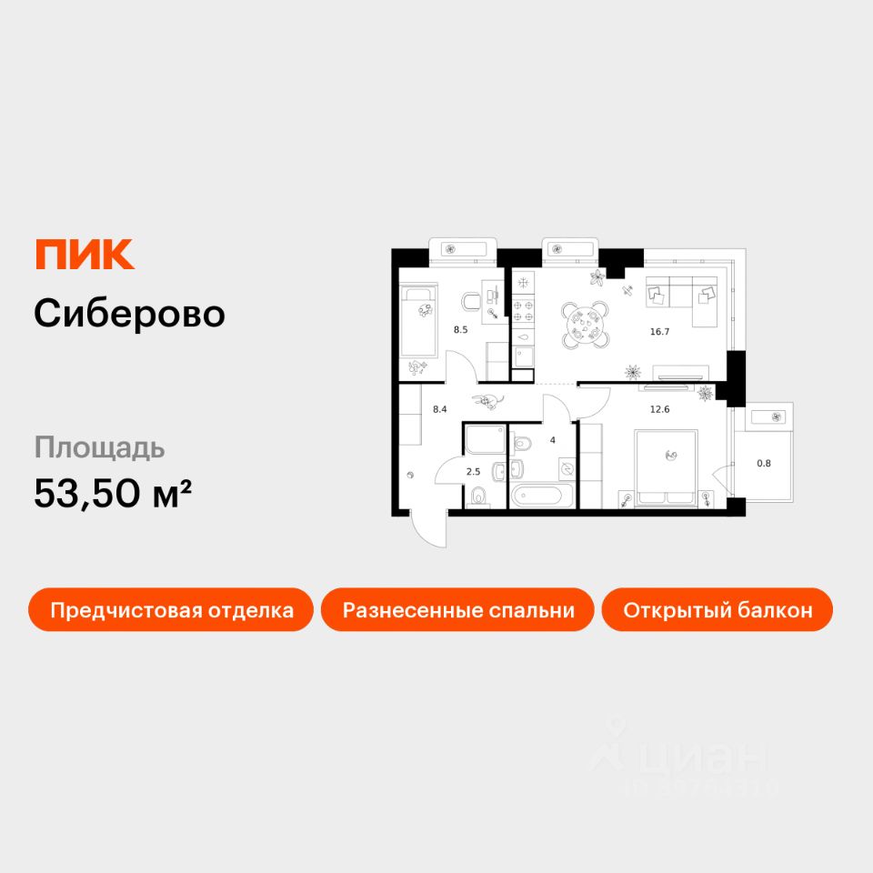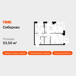 Продаётся 2-комн. квартира площадью 53,5 кв.м на 5 этаже 16 этажного дома (Корпус 3, Секция 1) проекта ПИК Сиберово. Светлый просторный подъезд на уровне земли, функциональная планировка, большие окна, предчистовая отделка.