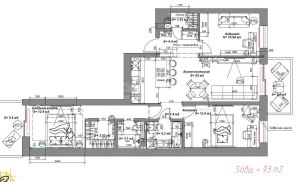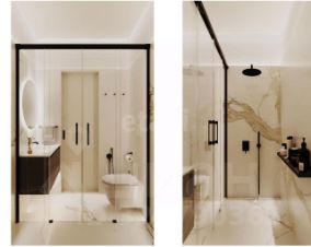 Ремонт выполнен с использованием дорогих импортных материалов. Напольное покрытие — инженерная доска, потолки из гипсокартона, в санузлах крупноформатный керамогранит от испанских производителей. Мебель выполнена по индивидуальному заказу.