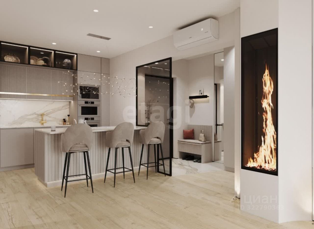 В кухне-гостиной установлен электрокамин с подсветкой, который создаёт особый уют.