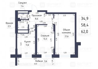 площадь 58,4 кв.м ,(с лоджией 62 кв.м.)