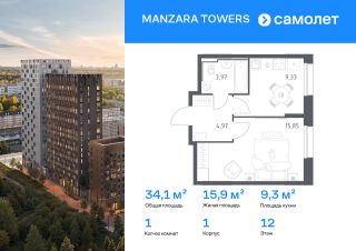 Строим кварталы для жизни с заботой о будущем. Предлагается 1-комнатная квартира комфорт-класса 34,12 кв.м в корпусе 1 на 12 этаже, в MANZARA TOWERS