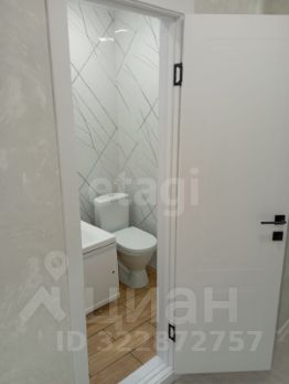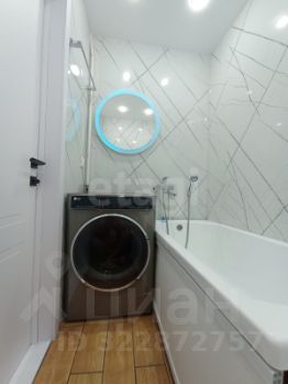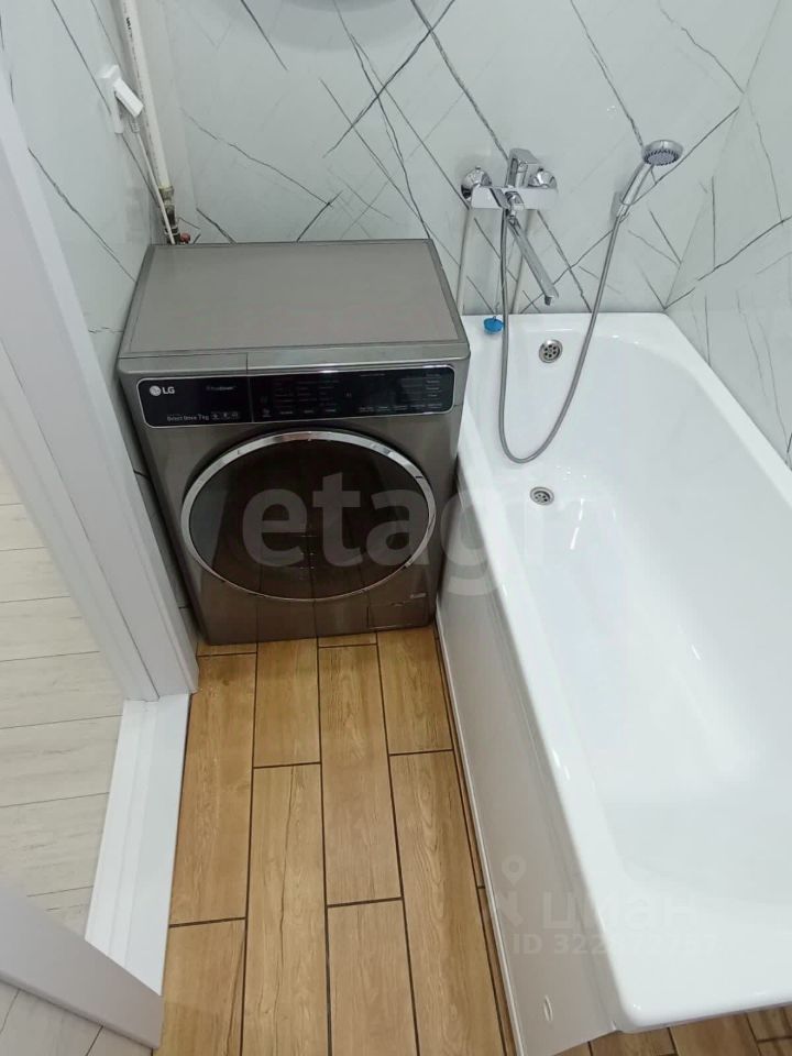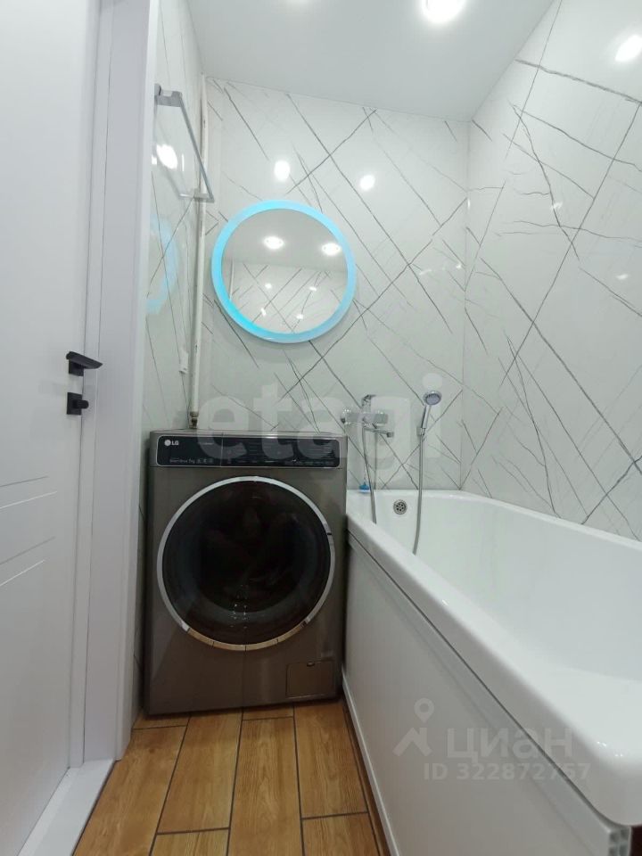 Ванная комната обустроена с практичным подходом: на полу уложена плитка, установлена новая акриловая ванна и современная сантехника, зеркало с подсветкой, а также остается стиральная машина.