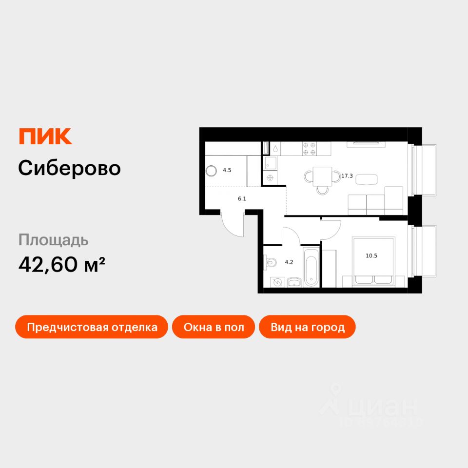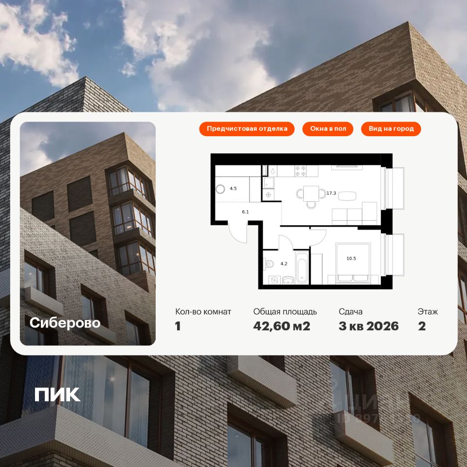 Продаётся 1-комн. квартира площадью 42,6 кв.м на 2 этаже 14 этажного дома (Корпус 2, Секция 5) проекта ПИК Сиберово. Светлый просторный подъезд на уровне земли, функциональная планировка, большие окна, предчистовая отделка.
