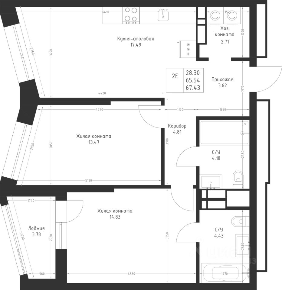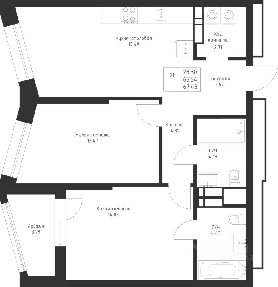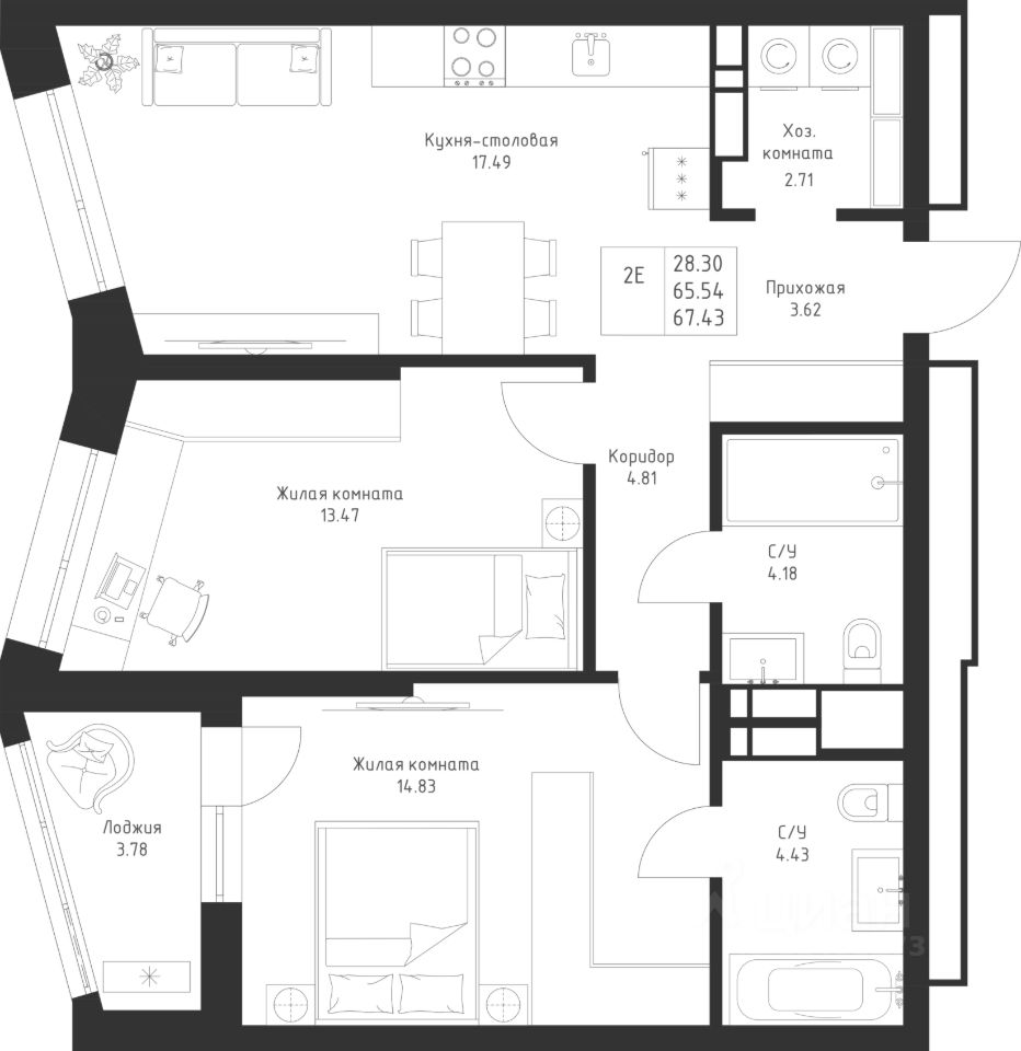 Просторная 2-комнатная квартира с большой евро-кухней. Площадь комнат позволяет зонировать пространство так, как необходимо именно вам.