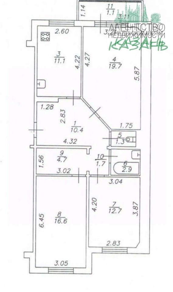- большая гостиная ~19,7 м², кухня ~11,1 м², две спальни/комнаты ~16,6 и 12,7 м² и другие вспомогательные помещения — всё отражено на приложенном плане.