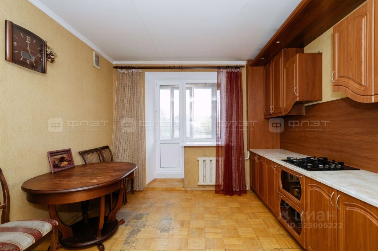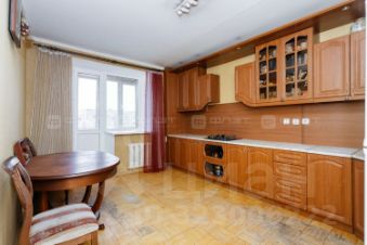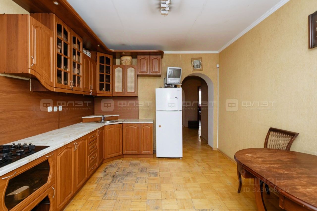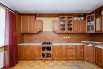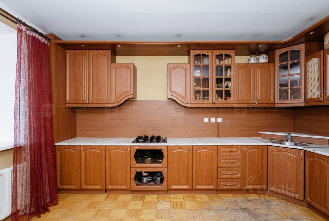 В просторной куxнe остается встроенный кухонный гарнитур, холодильник.