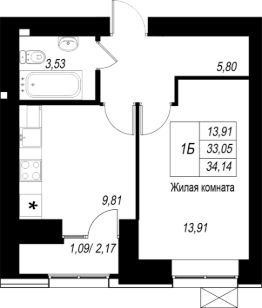 Продается 1 комнатная квартира 68 общей площадью: 34.14 кв.м. на 8 этаже.