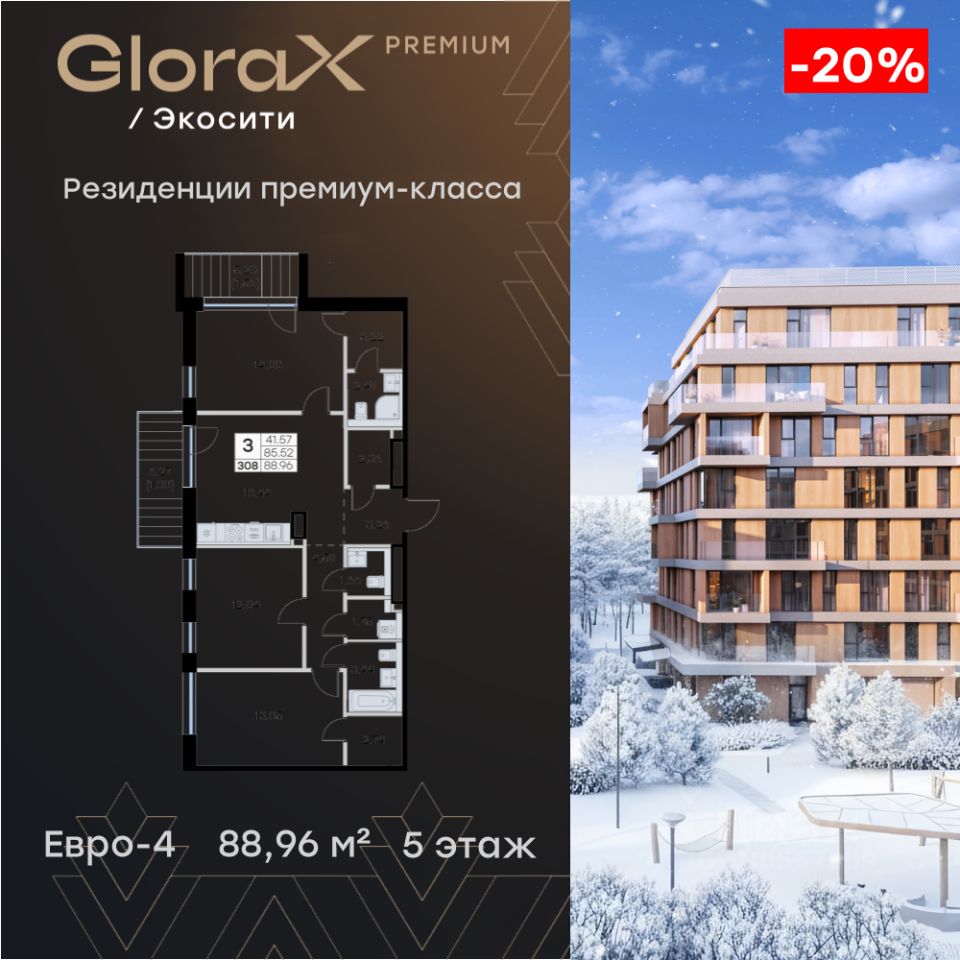 Продается 3-комн. квартира на 5-м этаже в строящемся проекте премиум-класса GloraX Premium Экосити. Общая площадь лота составляет 88,96 кв. м, из которых 41,57 кв. м отведено под жилую и 18,44 кв. м под кухонную зону. Номер квартиры - 308