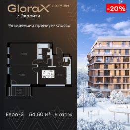 Продается 2-комн. квартира на 6-м этаже в строящемся проекте премиум-класса GloraX Premium Экосити. Общая площадь лота составляет 54,50 кв. м, из которых 27,11 кв. м отведено под жилую и 14,43 кв. м под кухонную зону. Номер квартиры - 315