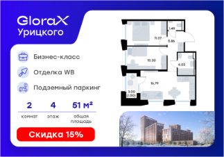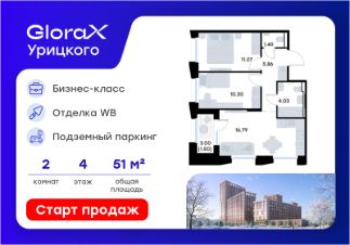 Продается 2-комн. квартира на 4-м этаже в квартале бизнес-класса GloraX Урицкого. Общая площадь лота составляет 51,04 кв. м, из которых 21,37 кв. м отведено под жилую и 16,79 кв. м под кухонную зону. Номер квартиры - 21