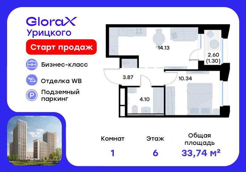 Продается 1-комн. квартира на 6-м этаже в квартале бизнес-класса GloraX Урицкого. Общая площадь лота составляет 33,74 кв. м, из которых 10,34 кв. м отведено под жилую и 14,13 кв. м под кухонную зону. Номер квартиры - 44