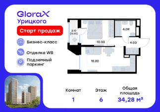 Продается 1-комн. квартира  на 6-м этаже в квартале бизнес-класса GloraX Урицкого. Общая площадь лота составляет 34,28 кв. м, из которых 10,33 кв. м отведено под жилую и 15,20 кв. м под кухонную зону. Номер квартиры - 121