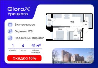 Продается 1-комн. квартира на 6-м этаже в квартале бизнес-класса GloraX Урицкого. Общая площадь лота составляет 41,07 кв. м, из которых 10,44 кв. м отведено под жилую и 17,62 кв. м под кухонную зону. Номер квартиры - 122