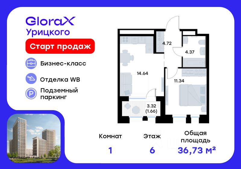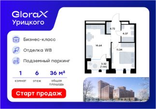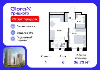 Продается 1-комн. квартира на 6-м этаже в квартале бизнес-класса GloraX Урицкого. Общая площадь лота составляет 36,73 кв. м, из которых 11,34 кв. м отведено под жилую и 14,64 кв. м под кухонную зону. Номер квартиры - 125
