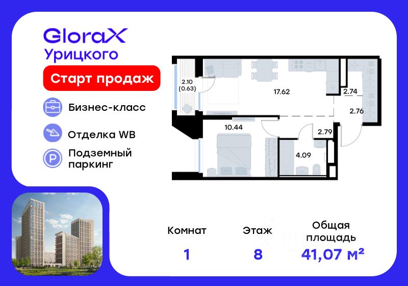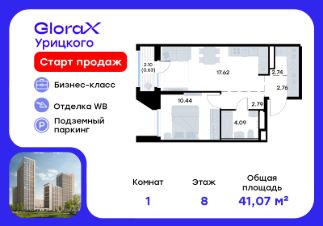 Продается 1-комн. квартира на 8-м этаже в квартале бизнес-класса GloraX Урицкого. Общая площадь лота составляет 41,07 кв. м, из которых 10,44 кв. м отведено под жилую и 17,62 кв. м под кухонную зону. Номер квартиры - 134