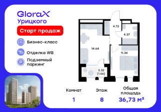 Продается 1-комн. квартира на 8-м этаже в квартале бизнес-класса GloraX Урицкого. Общая площадь лота составляет 36,73 кв. м, из которых 11,34 кв. м отведено под жилую и 14,64 кв. м под кухонную зону. Номер квартиры - 137