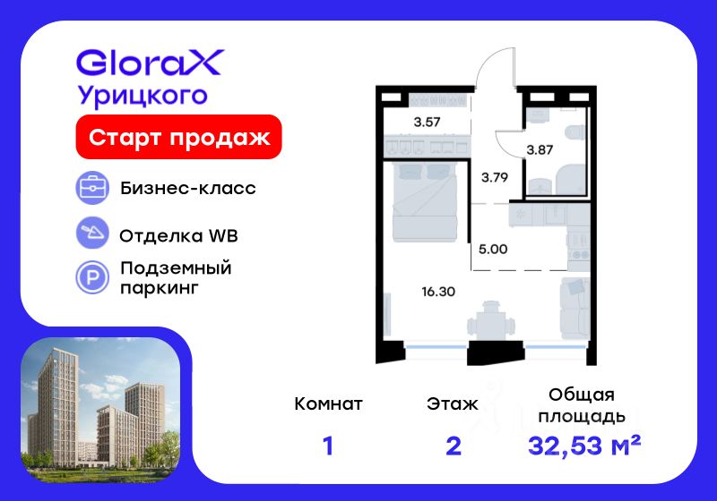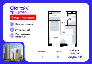 Продается квартира-студия на 2-м этаже в квартале бизнес-класса GloraX Урицкого. Общая площадь лота составляет 32,53 кв. м, из которых 16,30 кв. м отведено под жилую и 5,00 кв. м под кухонную зону. Номер квартиры - 204