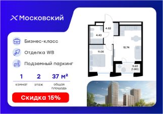 Продается 1-комн. квартира на 2-м этаже в квартале бизнес-класса Московский. Общая площадь лота составляет 37,54 кв. м, из которых 11,05 кв. м отведено под жилую и 15,74 кв. м под кухонную зону. Номер квартиры - 205