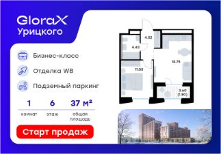 Продается 1-комн. квартира на 6-м этаже в квартале бизнес-класса GloraX Урицкого. Общая площадь лота составляет 37,54 кв. м, из которых 11,05 кв. м отведено под жилую и 15,74 кв. м под кухонную зону. Номер квартиры - 225