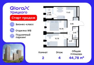 Продается 2-комн. квартира на 4-м этаже в квартале бизнес-класса GloraX Урицкого. Общая площадь лота составляет 44,78 кв. м, из которых 21,13 кв. м отведено под жилую и 11,63 кв. м под кухонную зону. Номер квартиры - 277
