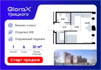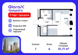 Продается квартира-студия на 6-м этаже в квартале бизнес-класса GloraX Урицкого. Общая площадь лота составляет 31,71 кв. м, из которых 15,84 кв. м отведено под жилую и 5,06 кв. м под кухонную зону. Номер квартиры - 289