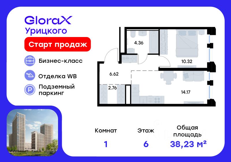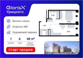 Продается 1-комн. квартира на 6-м этаже в квартале бизнес-класса GloraX Урицкого. Общая площадь лота составляет 38,23 кв. м, из которых 10,32 кв. м отведено под жилую и 14,17 кв. м под кухонную зону. Номер квартиры - 290
