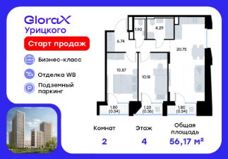 Продается 2-комн. квартира на 4-м этаже в квартале бизнес-класса GloraX Урицкого. Общая площадь лота составляет 56,17 кв. м, из которых 21,05 кв. м отведено под жилую и 20,75 кв. м под кухонную зону. Номер квартиры - 409