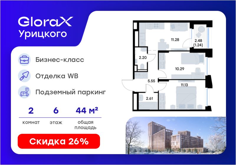 Продается 2-комн. квартира на 6-м этаже в квартале бизнес-класса GloraX Урицкого. Общая площадь лота составляет 44,30 кв. м, из которых 21,42 кв. м отведено под жилую и 11,28 кв. м под кухонную зону. Номер квартиры - 420