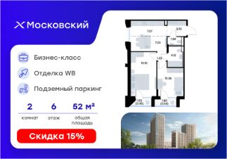 Продается 2-комн. квартира на 6-м этаже в квартале бизнес-класса Московский. Общая площадь лота составляет 52,28 кв. м, из которых 25,66 кв. м отведено под жилую и 14,50 кв. м под кухонную зону. Номер квартиры - 424