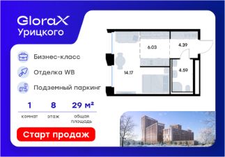 Продается квартира-студия на 8-м этаже в квартале бизнес-класса GloraX Урицкого. Общая площадь лота составляет 29,18 кв. м, из которых 14,17 кв. м отведено под жилую и 6,03 кв. м под кухонную зону. Номер квартиры - 432