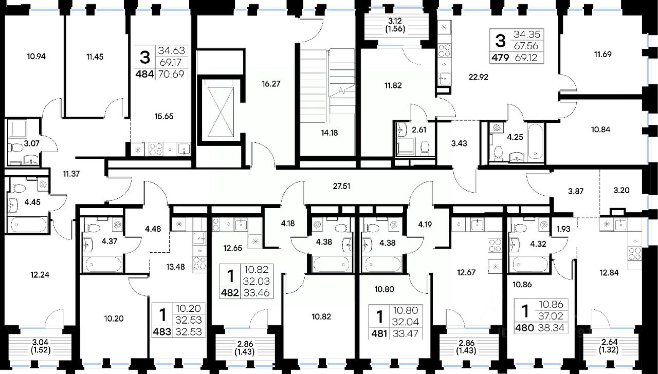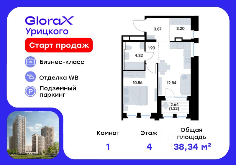 Продается 1-комн. квартира на 4-м этаже в квартале бизнес-класса GloraX Урицкого. Общая площадь лота составляет 38,34 кв. м, из которых 10,86 кв. м отведено под жилую и 12,84 кв. м под кухонную зону. Номер квартиры - 480