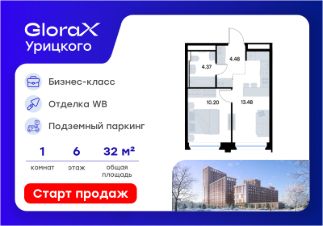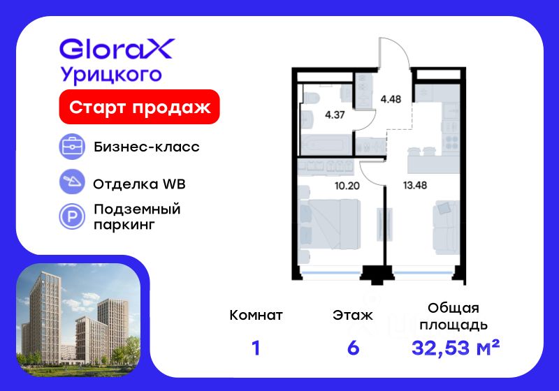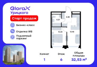 Продается 1-комн. квартира на 6-м этаже в квартале бизнес-класса GloraX Урицкого. Общая площадь лота составляет 32,53 кв. м, из которых 10,20 кв. м отведено под жилую и 13,48 кв. м под кухонную зону. Номер квартиры - 495
