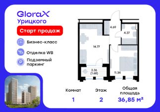 Продается 1-комн. квартира на 2-м этаже в квартале бизнес-класса GloraX Урицкого. Общая площадь лота составляет 36,85 кв. м, из которых 11,34 кв. м отведено под жилую и 14,77 кв. м под кухонную зону. Номер квартиры - 511