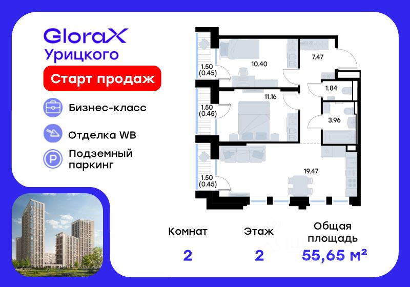 Продается 2-комн. квартира на 2-м этаже в квартале бизнес-класса GloraX Урицкого. Общая площадь лота составляет 55,65 кв. м, из которых 21,56 кв. м отведено под жилую и 19,47 кв. м под кухонную зону. Номер квартиры - 512