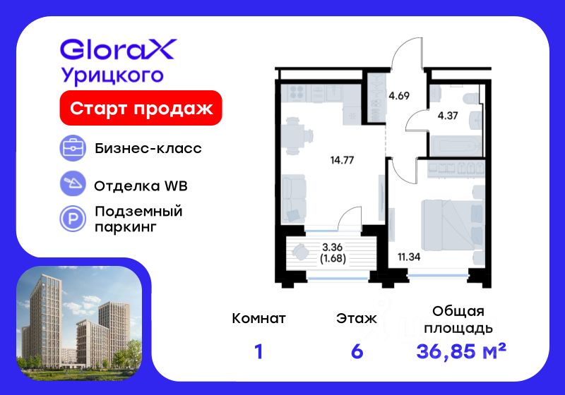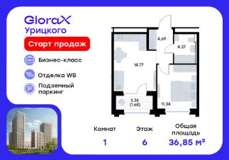 Продается 1-комн. квартира на 6-м этаже в квартале бизнес-класса GloraX Урицкого. Общая площадь лота составляет 36,85 кв. м, из которых 11,34 кв. м отведено под жилую и 14,77 кв. м под кухонную зону. Номер квартиры - 531