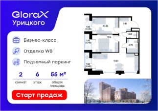 Продается 2-комн. квартира на 6-м этаже в квартале бизнес-класса GloraX Урицкого. Общая площадь лота составляет 55,67 кв. м, из которых 21,56 кв. м отведено под жилую и 19,47 кв. м под кухонную зону. Номер квартиры - 532