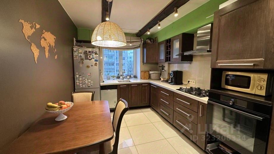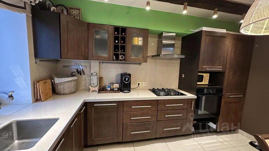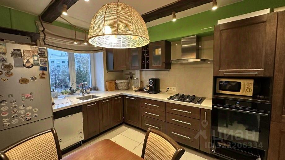 Кухня 10,2 квм, качественный кухонный гарнитур шоколадного цвета, раковина у окна- современное решение, потолок выделен деревянными балками.