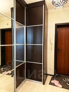 Прихожая: Большой встроенный шкаф-градеробная вмещает всё необходимое: одежду, обувь, бытовые принадлежности, канцелярию и даже гладильную доску. Пространство выглядит свободно благодаря зеркалам на дверцах шкафа.