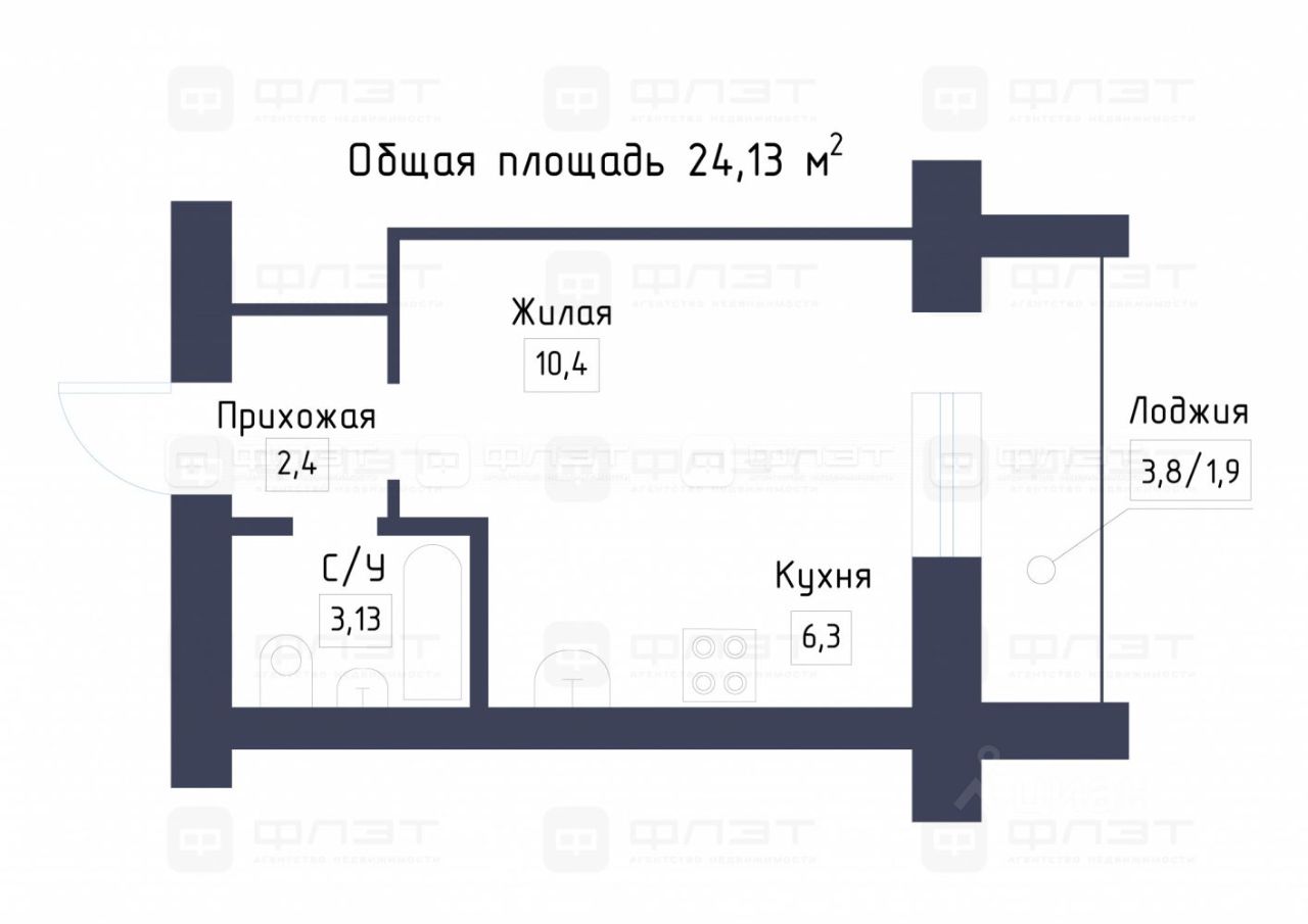 Общая площадь квартиры - 24,13 кв.м, из них:  кухня-гостиная - 14 кв.м.